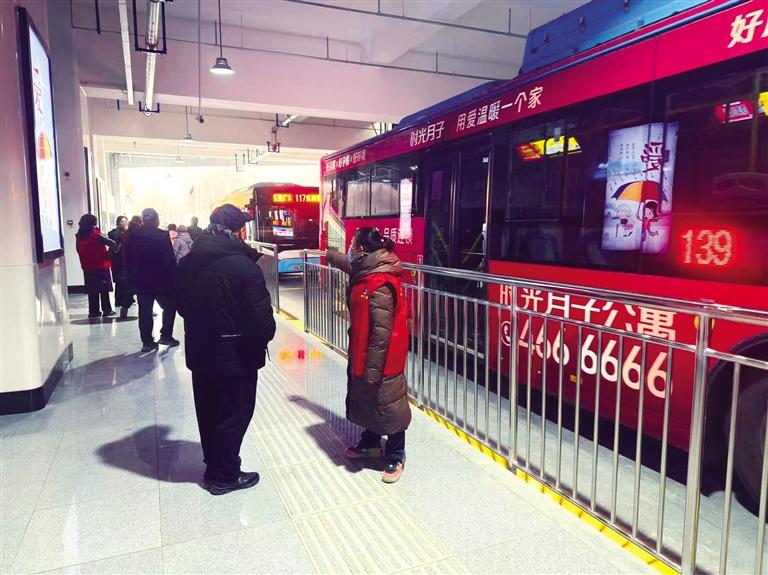 志愿者引导市民在新投入运行的公交场站有序乘车