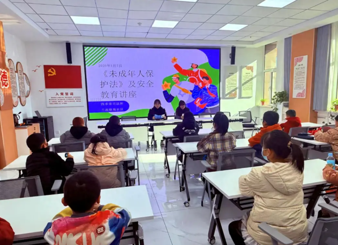 四季青司法所联合兰西铁苑社区组建“护娃联盟”,将《中华人民共和国未成年人保护法》宣讲与安全教育深度融合。活动以“脱口秀”形式解读了未成年人网络打赏、网吧准入等核心条款,用身边案例、顺口溜增强知识趣味性;同步开启“安全闯关赛”,通过动画演示、互动问答讲解交通、消防、网络等安全要点,发放《寒假未成年人保护倡议书》,引导家长履行监护责任,构建家校协同防护体系,让法律与安全知识入脑入心。