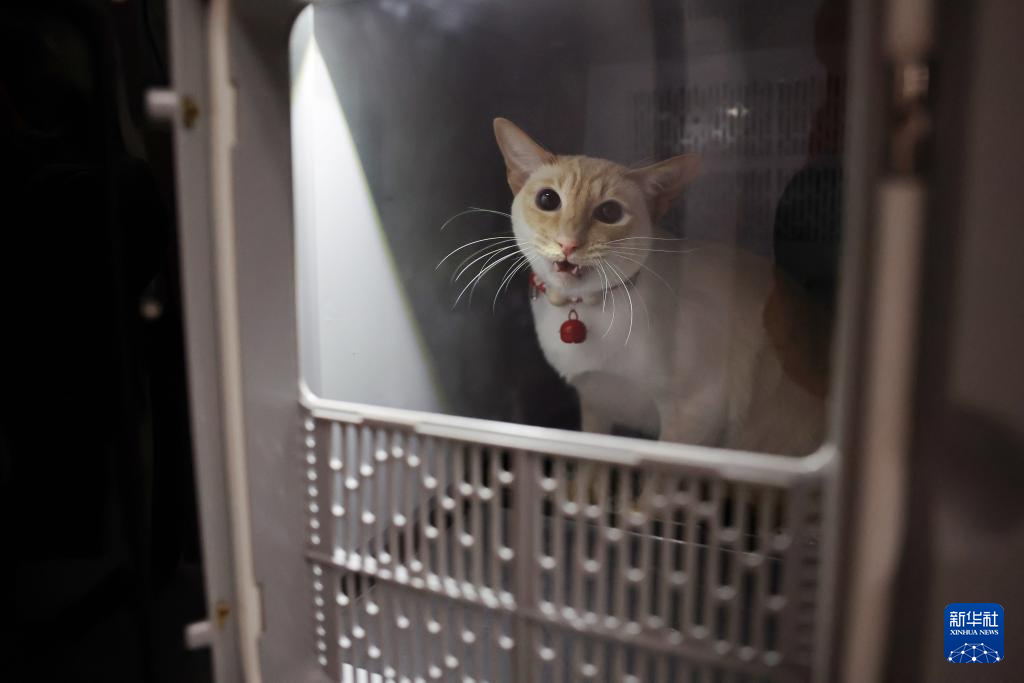 2月1日,一只小猫在中铁快运兰州西站营业部宠物交接区准备进入高铁宠物运输专用箱。新华社记者 陈斌 摄