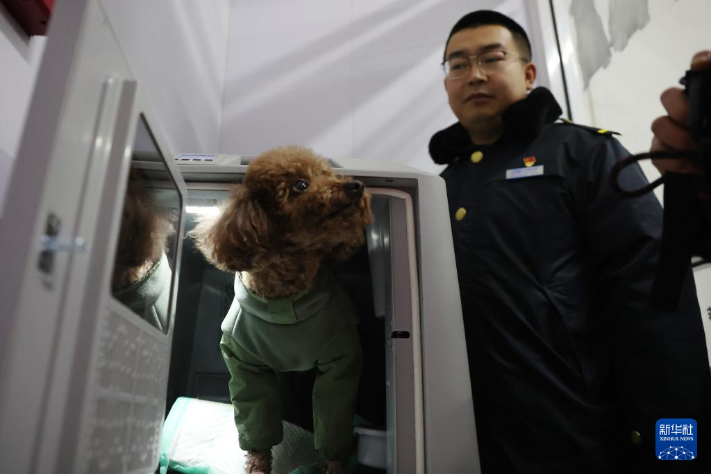 2月1日,在中铁快运兰州西站营业部宠物交接区,一只小狗进入高铁宠物运输专用箱等待托运。新华社记者 陈斌 摄