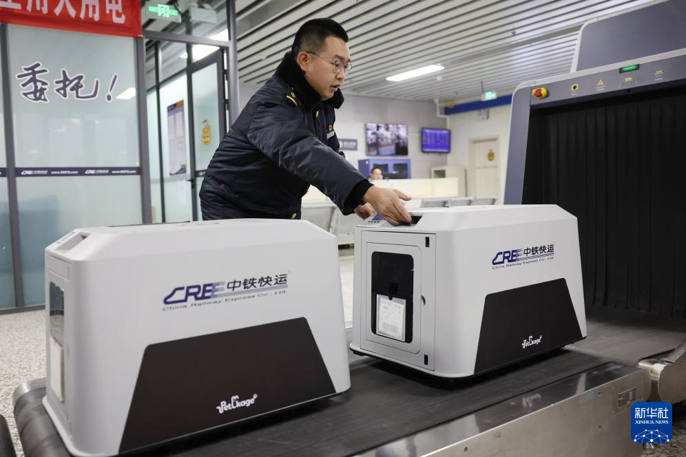 2月1日,中铁快运兰州西站营业部工作人员孙谦将旅客托运的宠物放在安检仪上准备进行安检。新华社记者 陈斌 摄