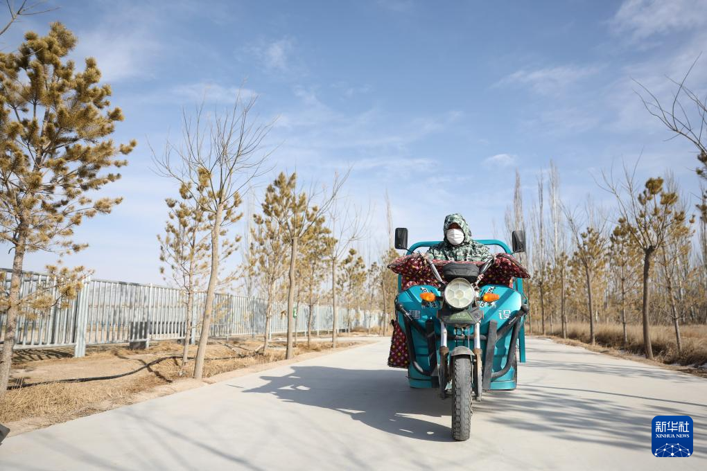 甘肃濒危动物保护中心普氏野马饲养繁育基地工作人员祁金龙骑着三轮车为普氏野马运送饲草料(2月3日摄)。新华社记者 陈斌 摄