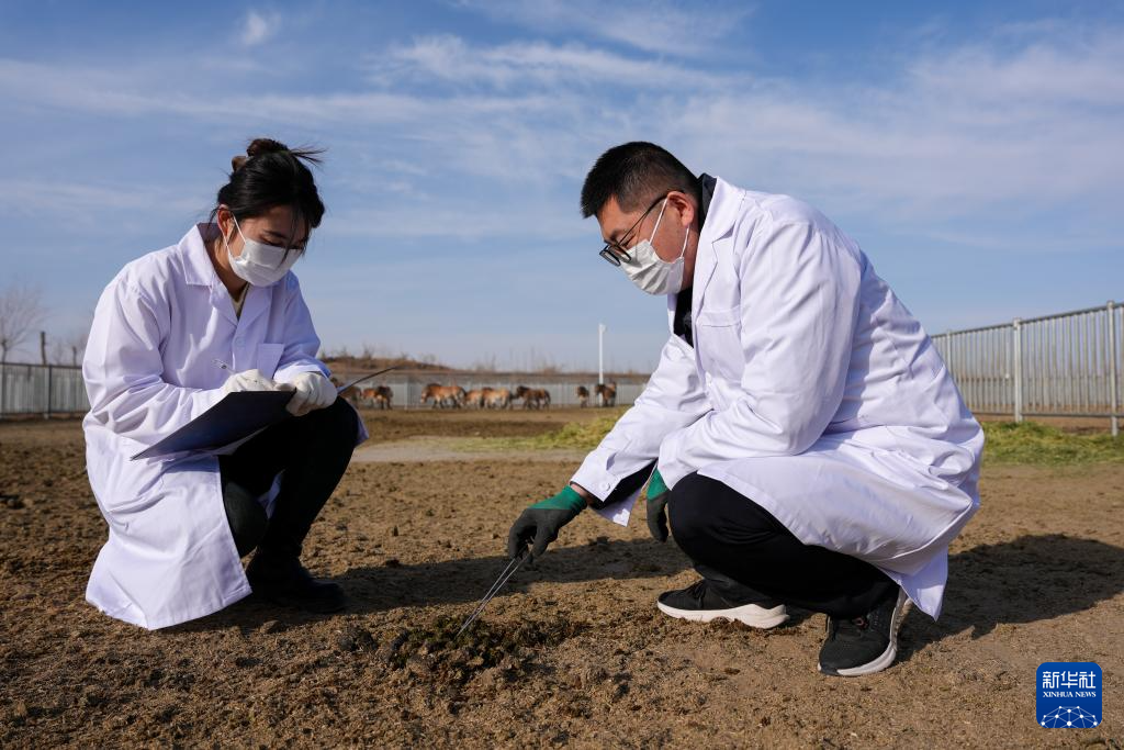 2月3日,在甘肃濒危动物保护中心普氏野马饲养繁育基地,工作人员观察普氏野马粪便。新华社记者 郎兵兵 摄