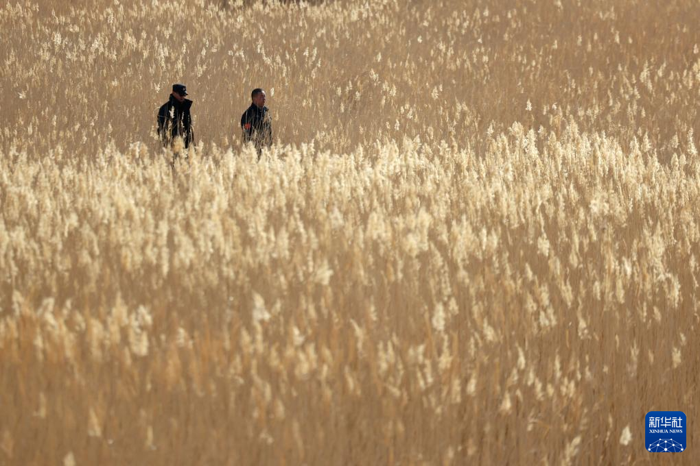 2月5日,甘肃敦煌西湖国家级自然保护区管护中心玉门关保护站站长吴兴东(右)和同事肖永刚在保护区内观察记录植被生长情况。新华社记者 郎兵兵 摄