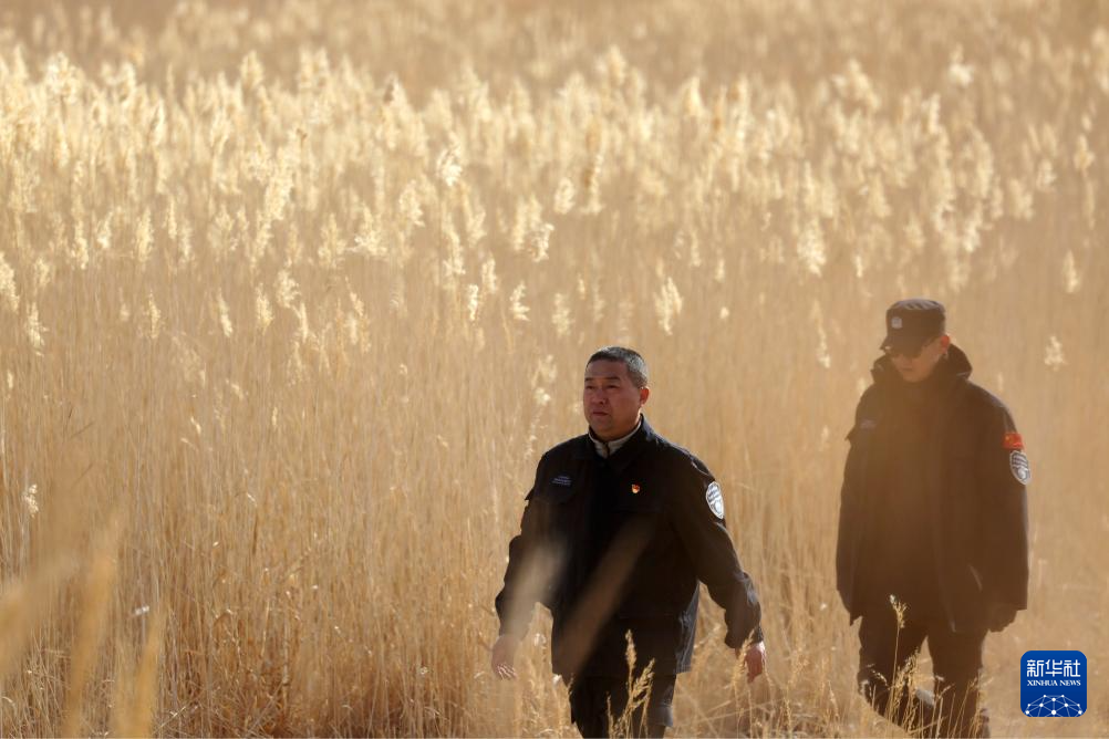2月5日,甘肃敦煌西湖国家级自然保护区管护中心玉门关保护站站长吴兴东(前)和同事在保护区内巡护。新华社记者 郎兵兵 摄