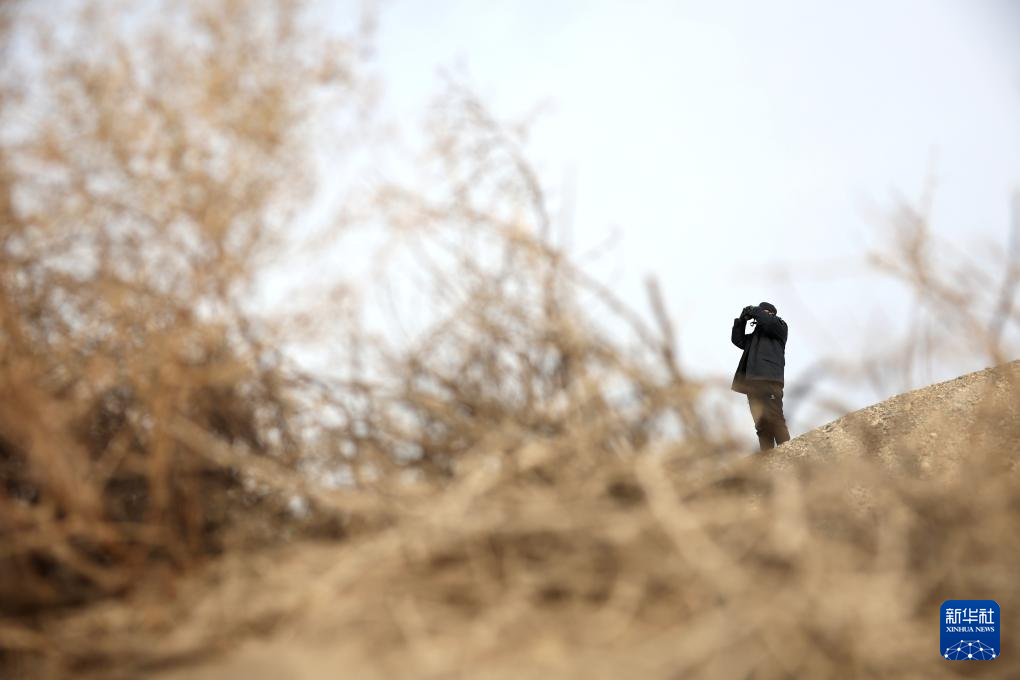 甘肃敦煌西湖国家级自然保护区管护中心玉门关保护站工作人员孙海隆在保护区内用望远镜查看普氏野马活动情况(2月5日摄)。新华社记者 陈斌 摄