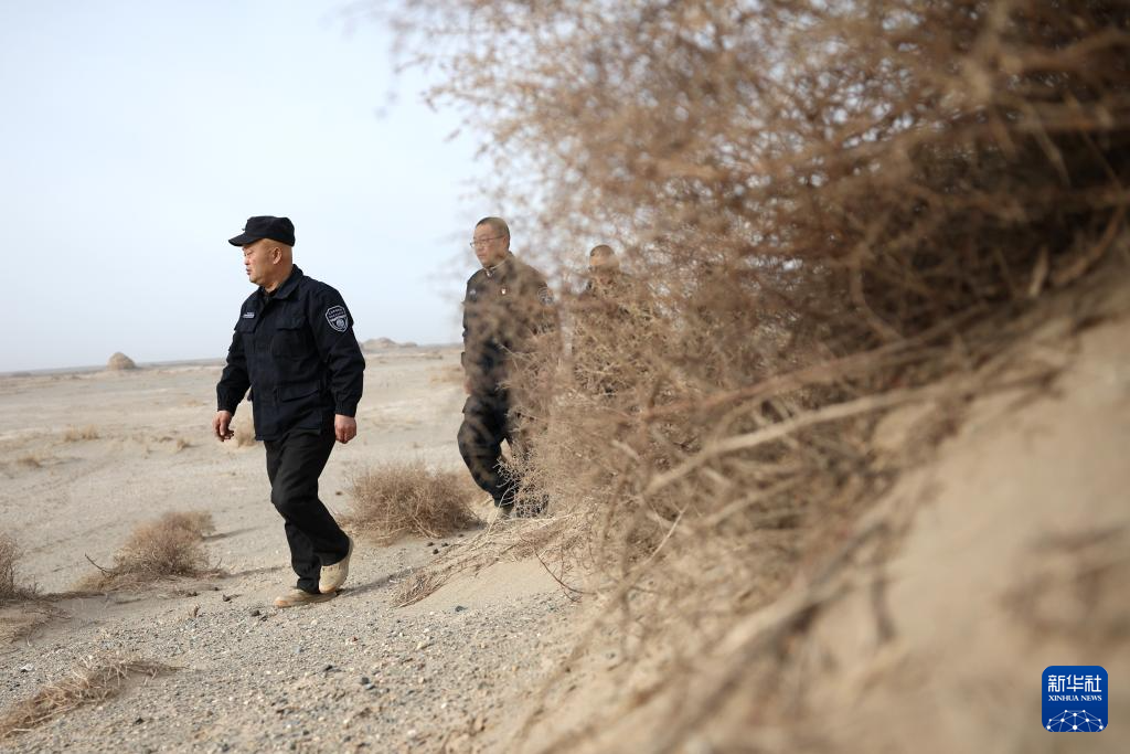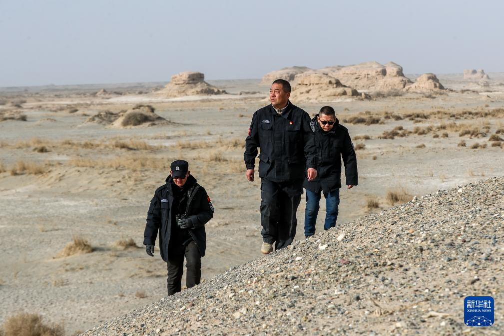 甘肃敦煌西湖国家级自然保护区管护中心玉门关保护站工作人员王成海(前)和同事在保护区内巡护(2月5日摄)。新华社记者 陈斌 摄
