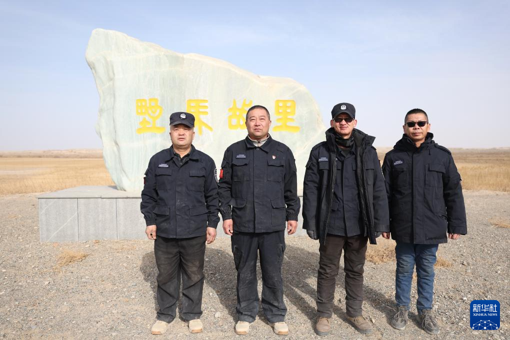 甘肃敦煌西湖国家级自然保护区管护中心玉门关保护站工作人员王成海、吴兴东、孙海隆、肖永刚(自左至右)在巡护结束后合影(2月5日摄)。新华社记者 陈斌 摄