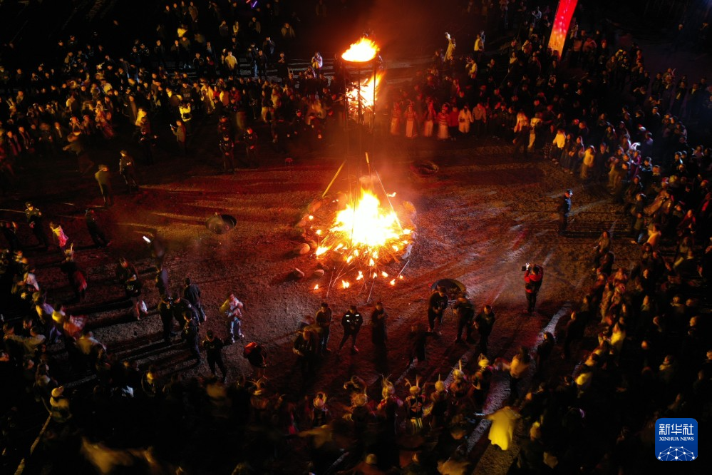 3月3日,在甘肃省陇南市文县铁楼藏族乡草河坝村,当地群众和游客一起跳火圈舞(无人机照片)。新华社记者 范培珅 摄