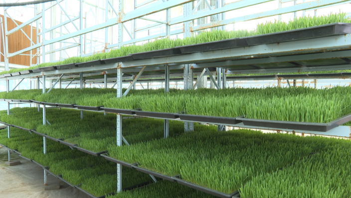 “我们采用立体式无土栽培技术,以大麦种子为主,生长周期为七到八天,然后进行采收。它的蛋白质含量非常高,可以达到30%-40%。另外,它富含18种氨基酸,牛、羊、骆驼等采食以后消化吸收利用率达90%,是其他牧草的3倍以上。”甘牧草源(甘肃)农业科技有限公司总经理刘渊说。