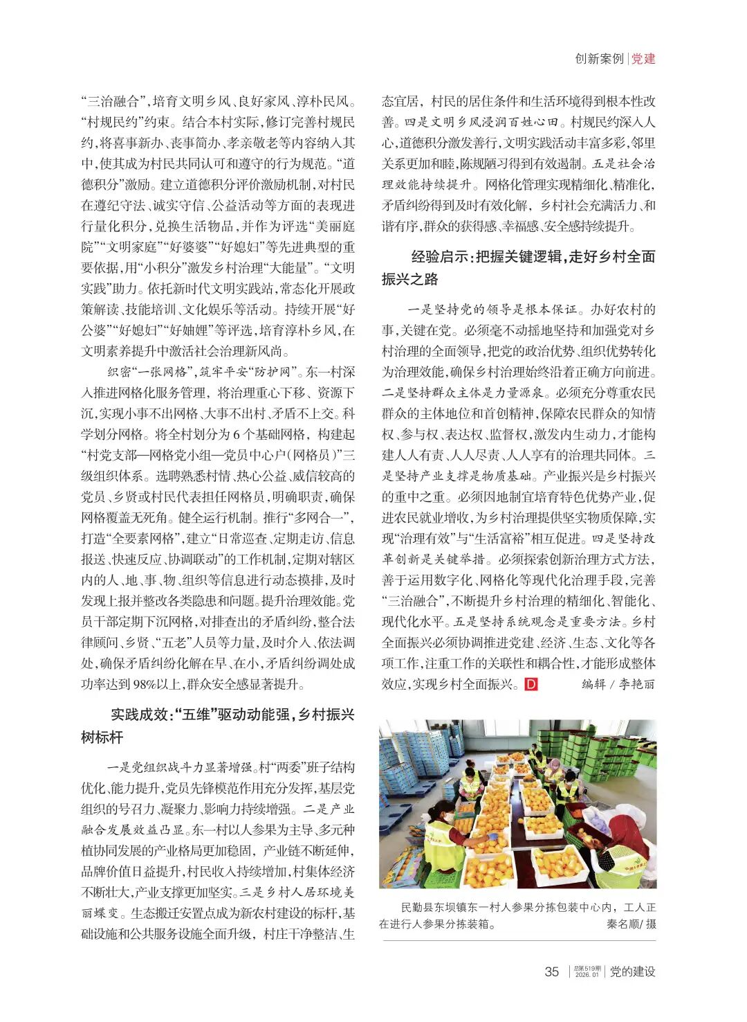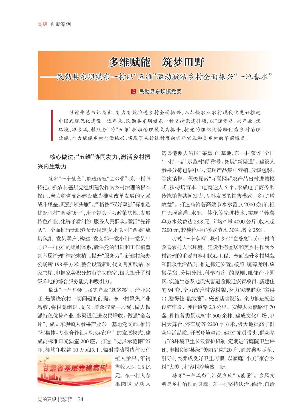 习近平总书记指出,有力有效推进乡村全面振兴,以加快农业农村现代化更好推进中国式现代化建设。近年来,民勤县东坝镇东一村坚持党建引领,以“强堡垒、兴产业、优环境、淳乡风、精服务”的“五维”驱动治理模式为抓手,把党的组织优势转化为乡村治理效能,全力赋能乡村全面振兴,实现了从传统村落向宜居宜业和美乡村的华丽蝶变。