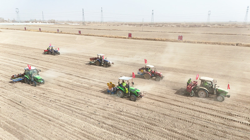 在金塔县东坝镇万亩粮食种植基地,浅埋滴灌小麦种植现场一片繁忙。农业机械往来穿梭,轰鸣声此起彼伏,全程机械化作业高效便捷,一次性完成播种、施肥、铺设滴灌带等多道工序,以科技赋能为春耕生产按下“快进键”。