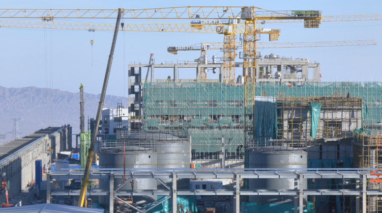 总投资411亿元的甘肃巨化新材料有限公司高性能硅氟新材料一体化项目建设正酣。全体施工人员紧盯6月30日实现中交的目标,加班加点、昼夜奋战。(卢建飞 摄)