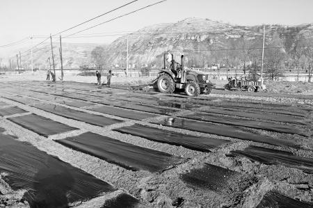 近日,岷县十里镇农民正在用农机进行耕地覆膜,为春耕春播作准备。目前,岷县洮河南北两岸,各乡镇农民抢农时、抓季节,田间地头到处一派繁忙景象。