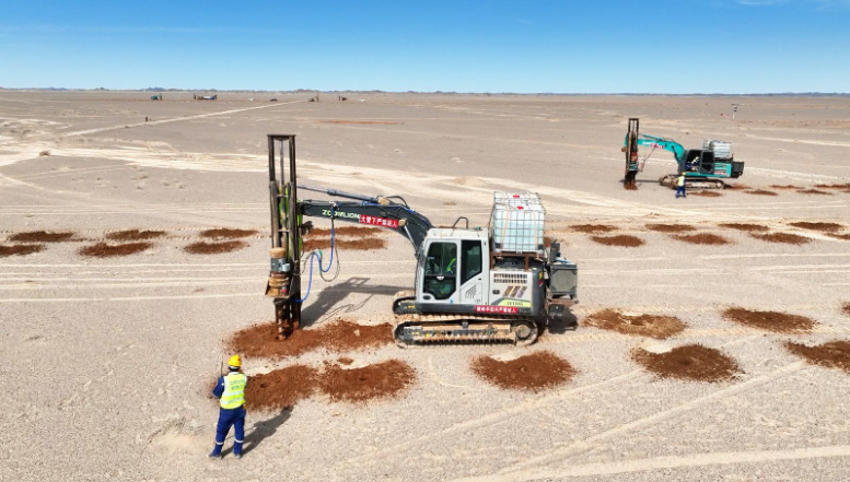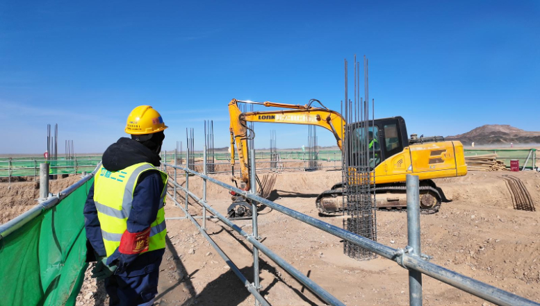 “目前,光伏区的桩基础浇筑工作已经完成总工程量的20%,进展顺利。按计划,我们将在4月份正式开始组件安装,全力冲刺‘6·30’并网目标。同时,升压站的主变基础、SVG基础等关键附属设施基础已全部浇筑完成,为后续设备安装打下了坚实基础。接下来,我们将严格按照节点计划,确保高标准、高质量完成全部建设任务。”中核汇能金塔县160万千瓦清洁能源保障项目/供电部分项目副经理刘金瑞介绍。