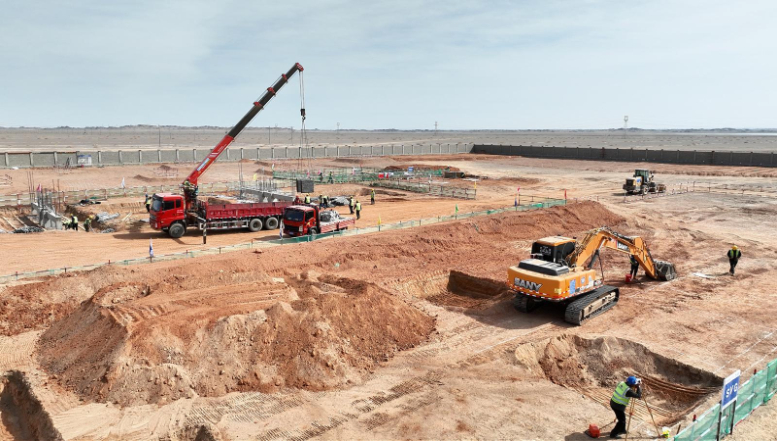 中核汇能金塔县160万千瓦清洁能源保障项目/供汽站部分项目副经理张荣归说:“目前,项目已进入土建攻坚与安装起步的关键阶段。现场5个主工艺厂房及3个厂前区厂房同步开展土建施工作业,土方开挖与混凝土浇筑逐步收尾完成。主设备电蒸汽锅炉已到货5台,首台锅炉已于3月16日顺利吊装就位,剩余设备正陆续到场开展吊装作业,这标志着现场正式进入工艺设备及回路安装工作,由‘地下’转‘地上’、由‘土建’转‘安装’的关键转换已经全面展开。”