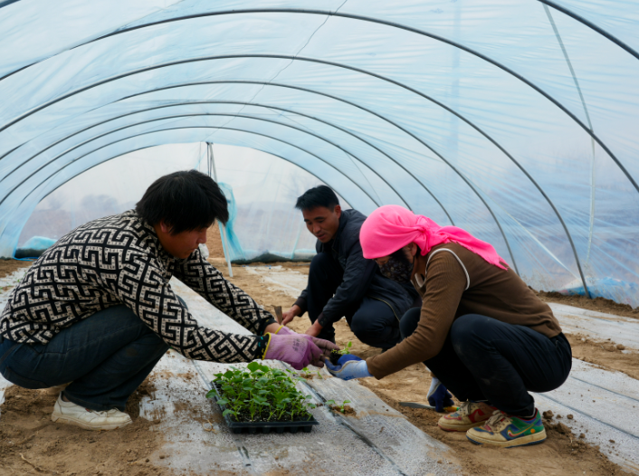 暖阳之下,大树塬村的农家院落旁,一座座崭新的小拱棚整齐排列,白色棚膜在阳光下熠熠生辉。村民何双会在邻居的帮助下,小心翼翼地栽种瓜苗,松土、放苗、覆土,动作娴熟,脸上满是期待。
