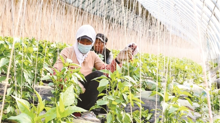 农户在大棚内管护辣椒。