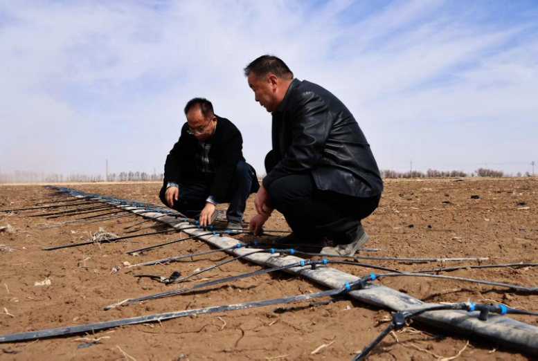 金川区双湾镇龙源村村民在检查滴灌带敷设情况