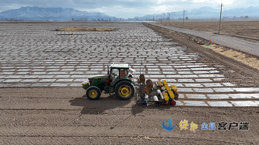 在永昌县的高标准农田里,机械化春耕作业有序推进,整齐的地膜田块与远处的祁连雪山相映成景