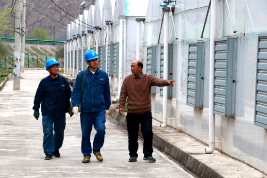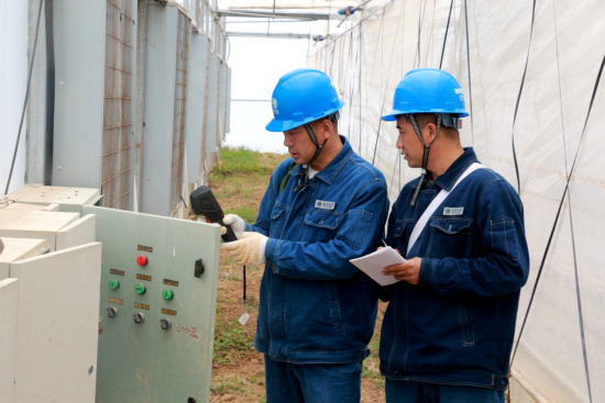 甘肃陇南西和县供电公司员工刘芳平、王新社在西和县顺风种植养殖农民专业合作社蔬菜种植大棚开展用电检查。