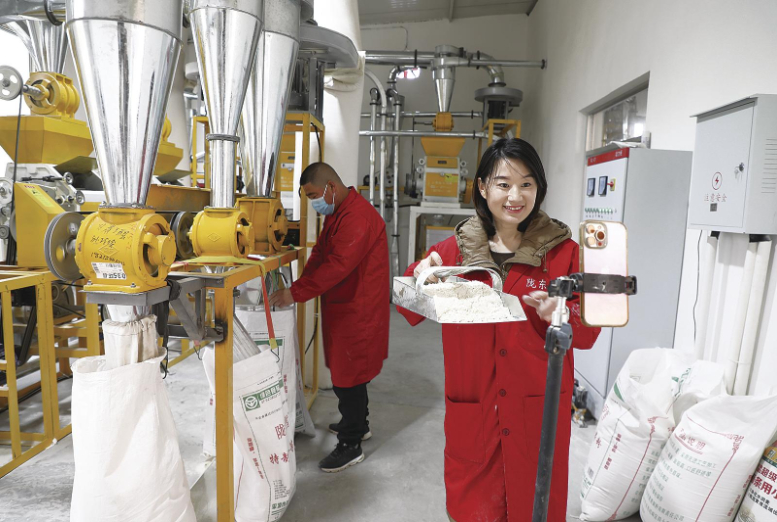 助农主播孙玲玲直播卖荞面。 庆阳融媒记者 乔洁 摄
