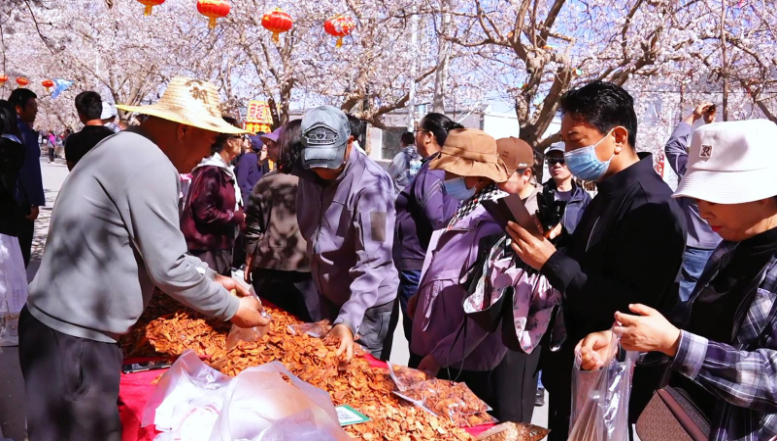 美食盛宴点燃游玩热情,农特产品展销也备受青睐。色泽金黄、酸甜可口的杏干成为游客选购的热门产品,搭配金塔黑醋、本土干果等优质农产品,吸引了众多游客驻足选购。