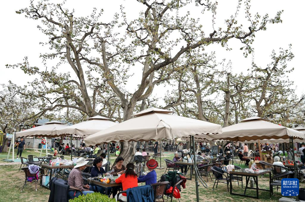 4月11日,游客在甘肃省兰州市皋兰县什川镇百年梨园内休闲游玩。新华社发(侯崇慧摄)