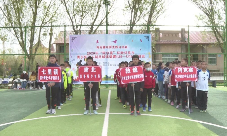 4月11日,阿克塞县2026年“阿尔曼”杯毗邻县市青少年五人制足球邀请赛(U9-U10组)在水上乐园足球场激情开赛。来自阿克塞、敦煌、肃北、七里镇的四支代表队参赛角逐。