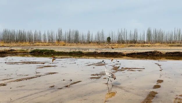 发现现场,一只体态优雅的灰鹤正悠然漫步于田垄之间。它时而低头在灌溉后湿润的土地上啄食残留的谷物、草根,时而挺直修长的脖颈,警觉地环顾这片陌生的“补给站”。