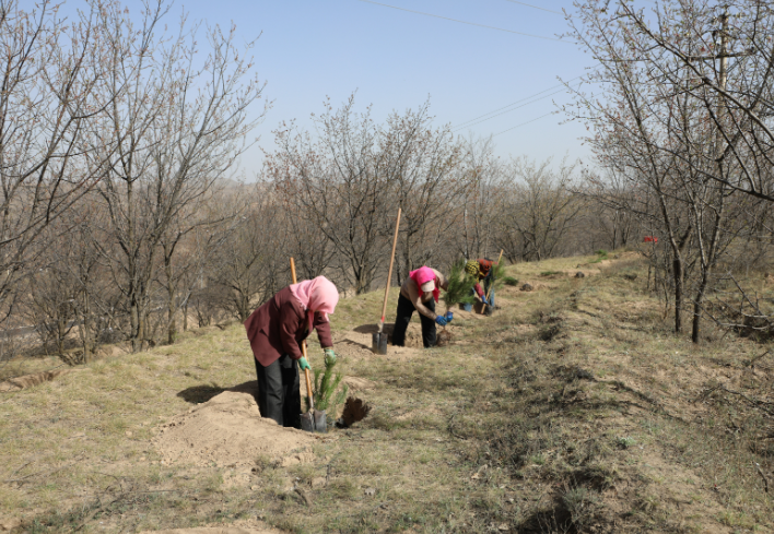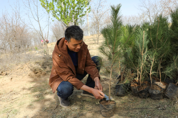 在加快造林进度的同时,环县同步推进技术升级,全力提高苗木成活率。在环城镇西川村“三北”工程退化林修复项目现场,村民通过鱼鳞坑整地、人工点播方式栽种油松,所有苗木均采用带土球、装营养杯的专业化培育模式。