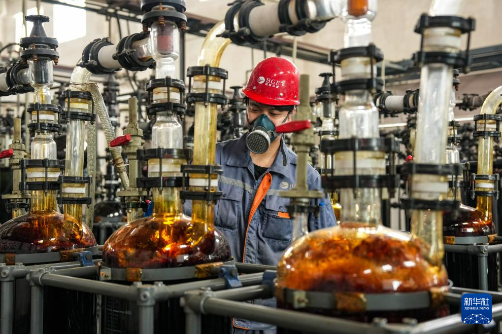 4月13日,在金昌神泥科技有限公司萃取车间,工作人员进行稀贵金属萃取作业。新华社记者 郎兵兵 摄