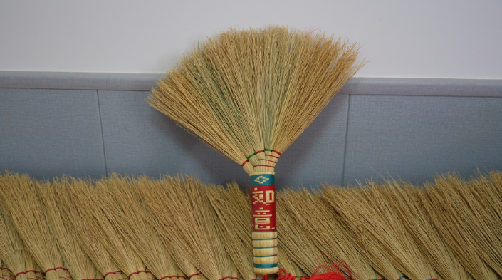 如今,成品已从单一的实用扫帚,扩展至装饰挂件、文创摆件三大类。手柄上编织的“吉祥”“幸福”等字样,搭配中国结与流苏,让寻常的笤帚承载了满满的民俗祝福。