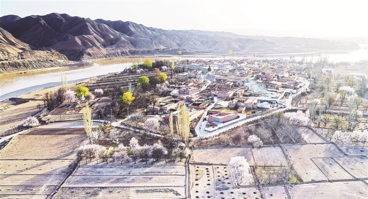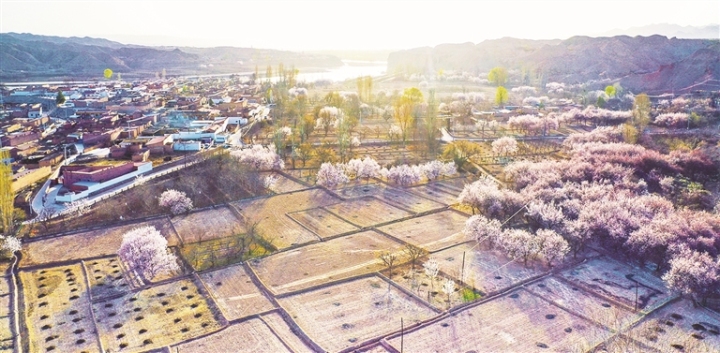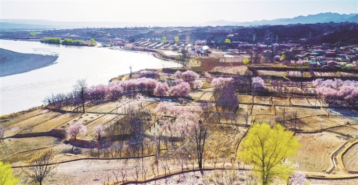 土黄沃野与悠悠黄河相映,粉白杏花、翠绿杨柳点缀其间,勾勒出一幅生机盎然的生态田园画卷,恰似春潮涌动,尽展陇原春日好风光。