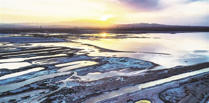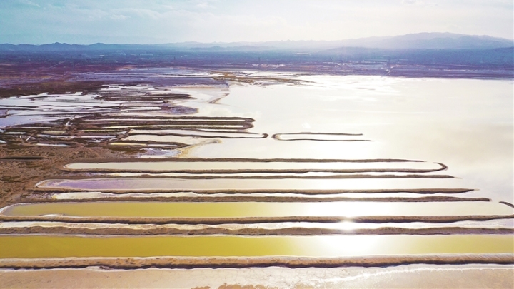 夕阳斜照,古盐田与盐生植物宛若覆雪,白润泛黄;盐池水面光影流转,如田黄玛瑙般温润剔透。形态各异的盐田或规整成条,或形似鸟兽,浑然天成,尽显大自然的鬼斧神工。