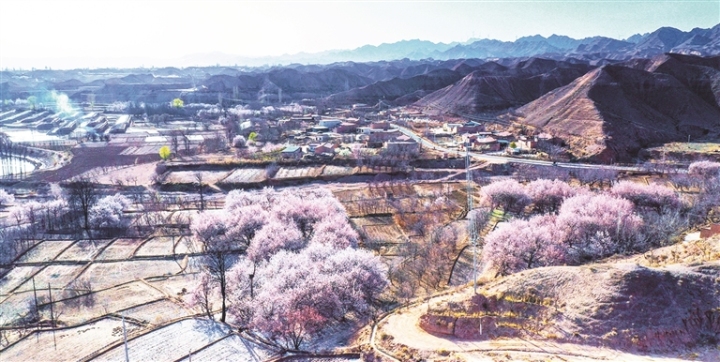 春风和煦,繁花竞放。黄河岸边的景泰县五佛乡碱湾、金坪村满目春色,在夕阳映照下,田园村落色彩斑斓,风光如画。