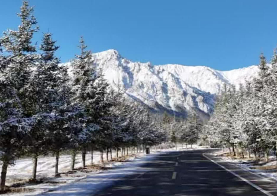 4月16日,雪后初晴的甘肃省肃南裕固族自治县马蹄石窟群旅游区,蓝天澄澈如洗,白云轻悠舒展,皑皑白雪衬着赭红岩壁崖窟,静怡空灵。(华尔旦)