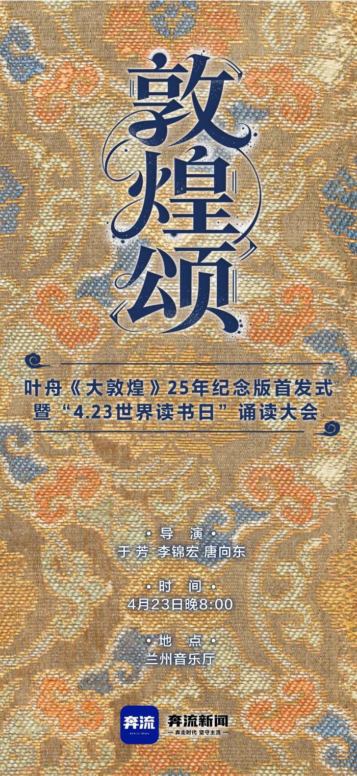 4月23日晚8时,“敦煌颂”叶舟《大敦煌》25年纪念版首发式暨“4.23世界读书日”诵读大会将在兰州音乐厅举办,以敦煌诗韵为全民阅读与“书香陇原”添彩。