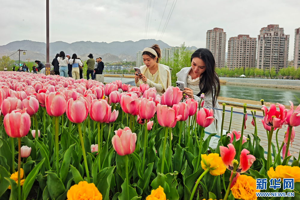 郁金香绽放,扮靓永靖黄河岸。新华网发(史有东摄)