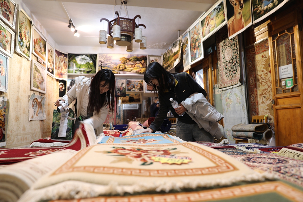 游客在八坊十三巷挑选毛毯。(王生元 摄)