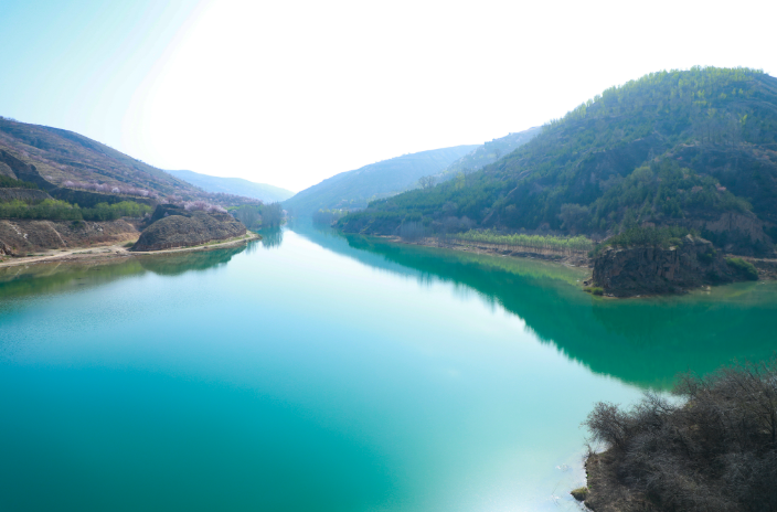 站在环县合道镇唐台子水库的大坝上,眼前是一池碧水,静卧在山峦之间。两岸垂柳轻拂,杏花初绽,水面波光粼粼,偶有飞鸟掠过,春意扑面而来。