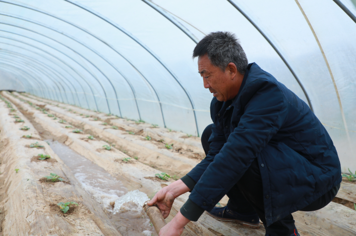 沿着水库前行不到一里地,就是合道镇红崖洼村的早春拱棚种植点,棚内绿意盎然,甜瓜苗整齐挺立。村民黄鑫正忙着给瓜苗放水——清澈的水流从唐台子水库引来,精准滴灌到每一株幼苗根部。