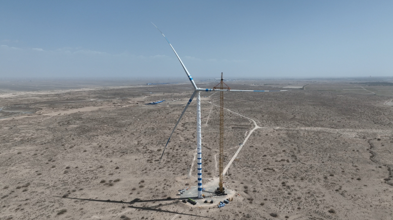 据了解,甘肃省首个“千乡万村驭风行动”瓜州试点项目规划总装机容量40MW,安装4台6.7MW、2台6.6MW风电机组,分别位于瓜州县瓜州镇头工村和西湖镇城北村。此次吊装的风电机组为6.7MW大容量机型,采用轮毂高140米、扫风直径221米,是专为乡村场景研发的高效智能机型,具备节地、低噪、智能化等显著优势。