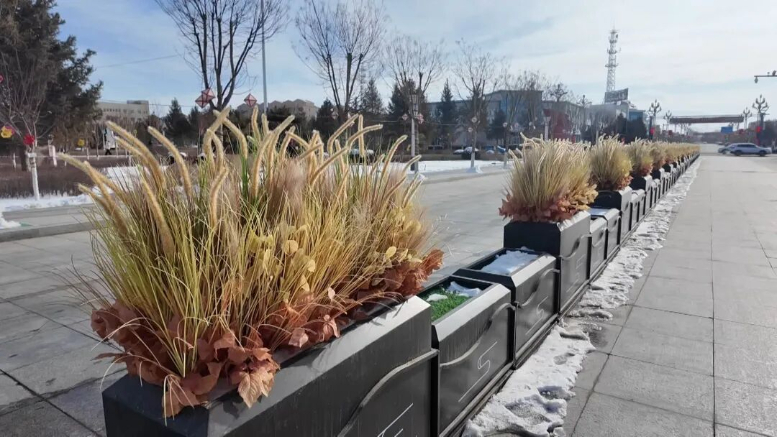 阿克塞县城冬季街头添亮色 仿真花扮靓市民出行路