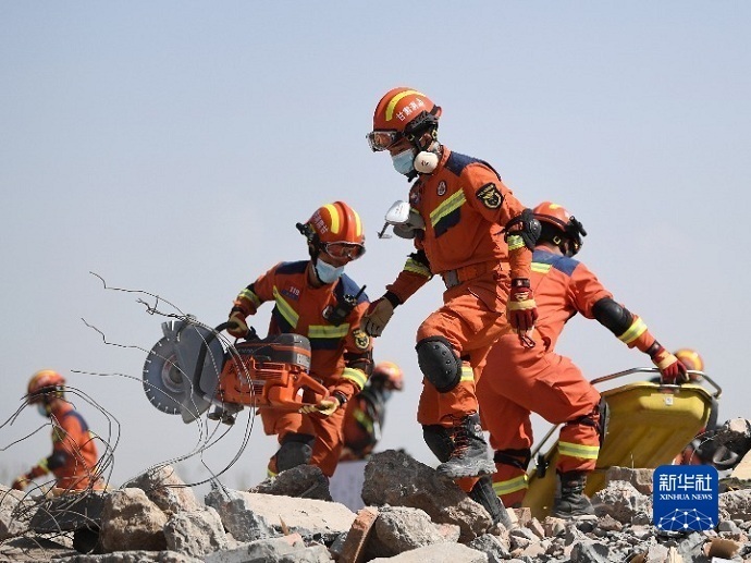 演习开始后,各路应急救援力量相继入场,当地应急力量率先突入,进行废墟搜救、伤员救治转运、损毁公路桥梁抢修等任务。同时,跨区应急力量紧急驰援,在坍塌铁路隧道、“西气东输”“西电东送”等重要基础设施领域紧急处置险情。消防救援队伍也火速开往山区进行“孤岛”救援救灾、雪山遇险人员搜救及景区被困游客搜救。