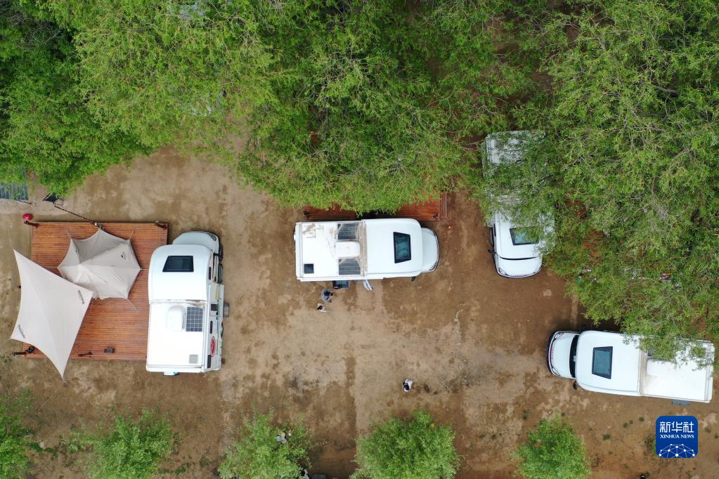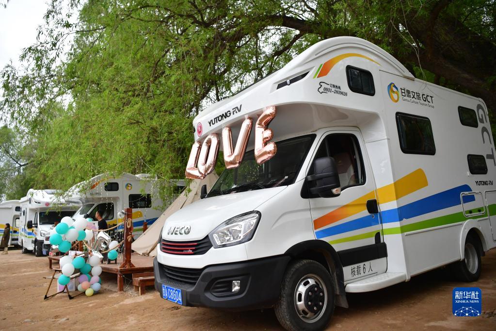 这是甘肃省永靖县刘家峡魏家坡房车露营地的房车“微度假”活动现场(5月20日摄)。新华社记者 陈斌 摄
