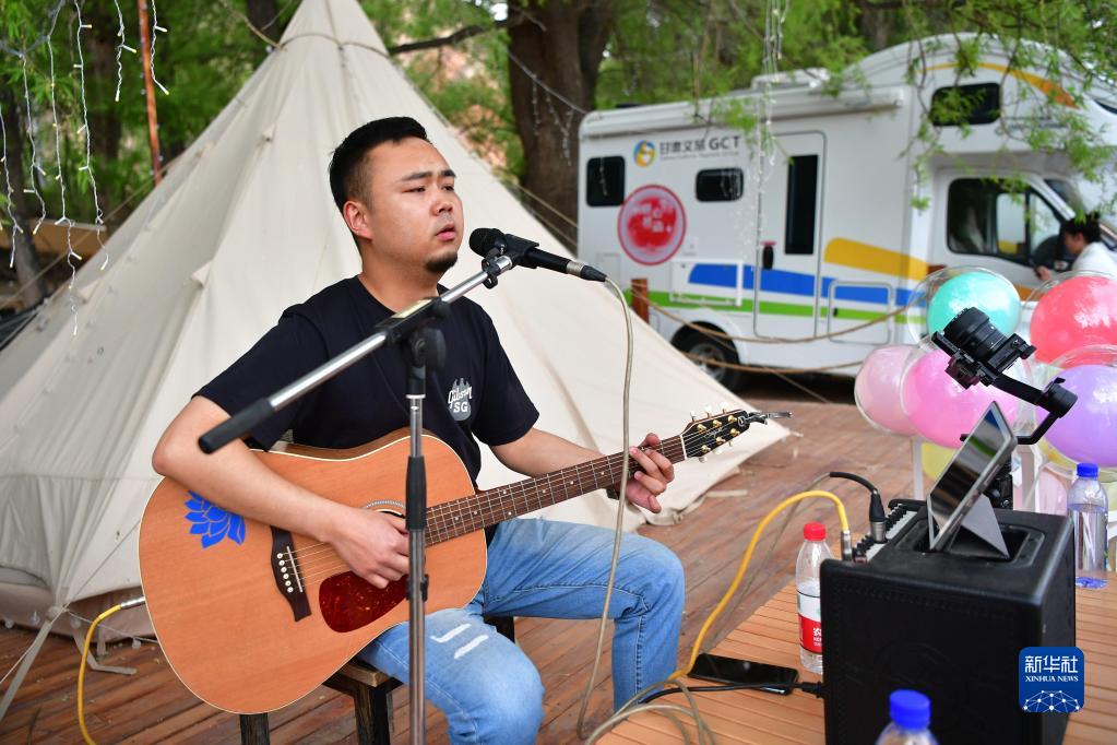 在甘肃省永靖县刘家峡魏家坡房车露营地,一名体验者在活动现场表演吉他弹唱(5月20日摄)。新华社记者 陈斌 摄