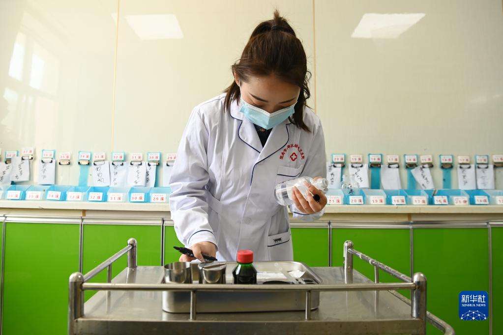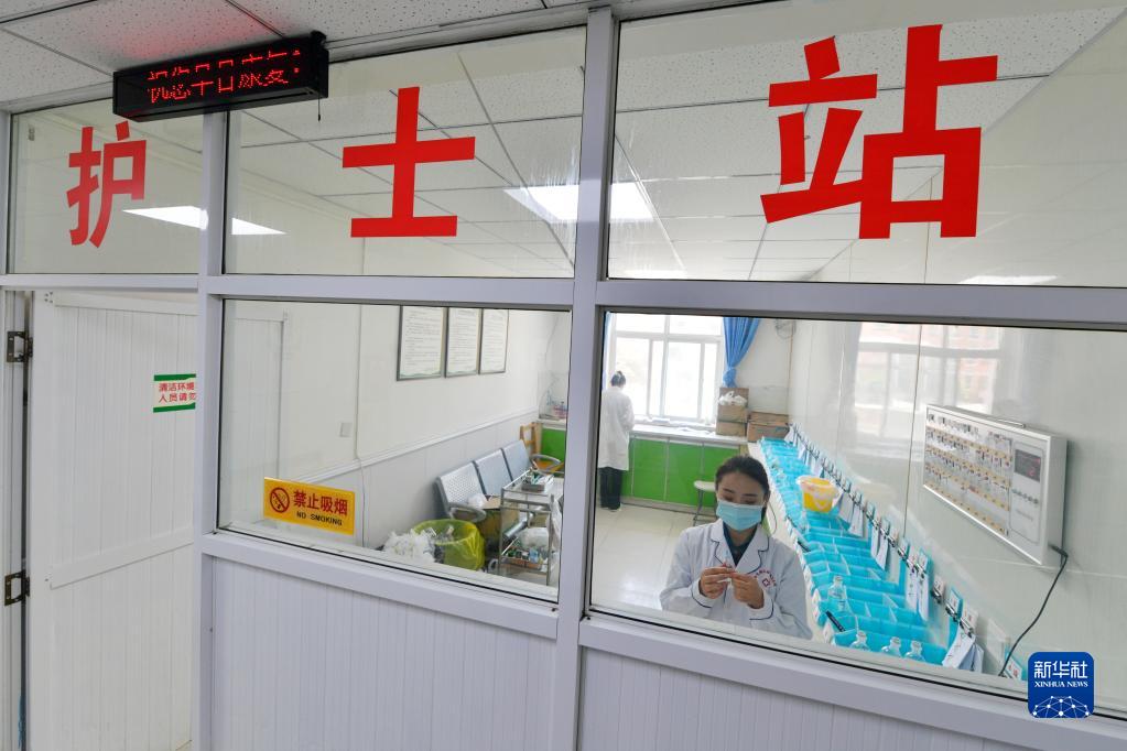 在武都区桔柑镇卫生院住院部护士站,李瑞给患者配药(5月11日摄)。新华社记者 范培珅 摄