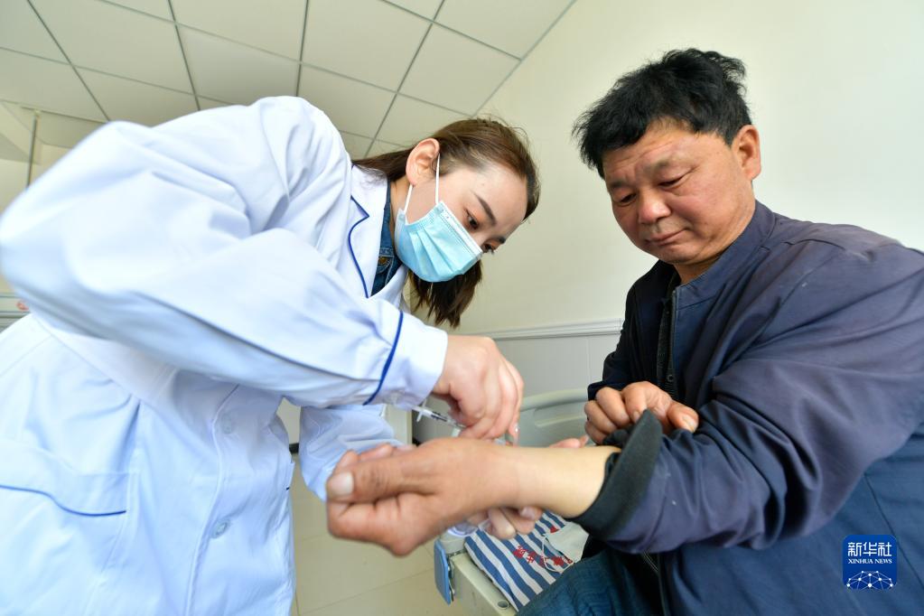 在武都区桔柑镇卫生院住院部病房,李瑞(左)给患者做皮试(5月11日摄)。新华社记者 范培珅 摄