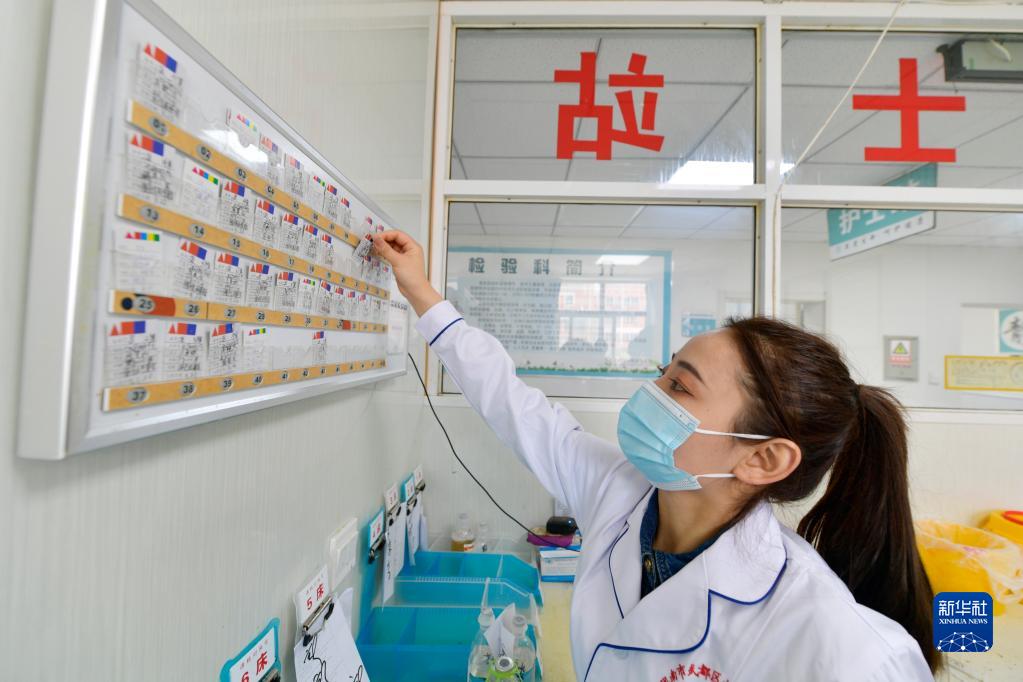 在武都区桔柑镇卫生院住院部护士站,李瑞将患者入院登记卡放入护士站信息栏(5月11日摄)。新华社记者 范培珅 摄